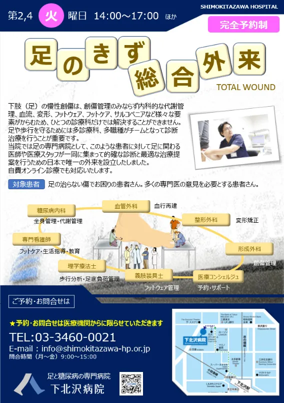 「足のきず総合外来受診希望」の旨お伝えください。担当の医局クラークにお繋ぎいたします。 医局クラークが電話に出られない場合は、大変申し訳ございませんが、折り返しのご対応とさせていただきます。